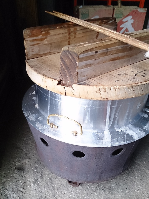 この釜でこしらえる赤飯は
