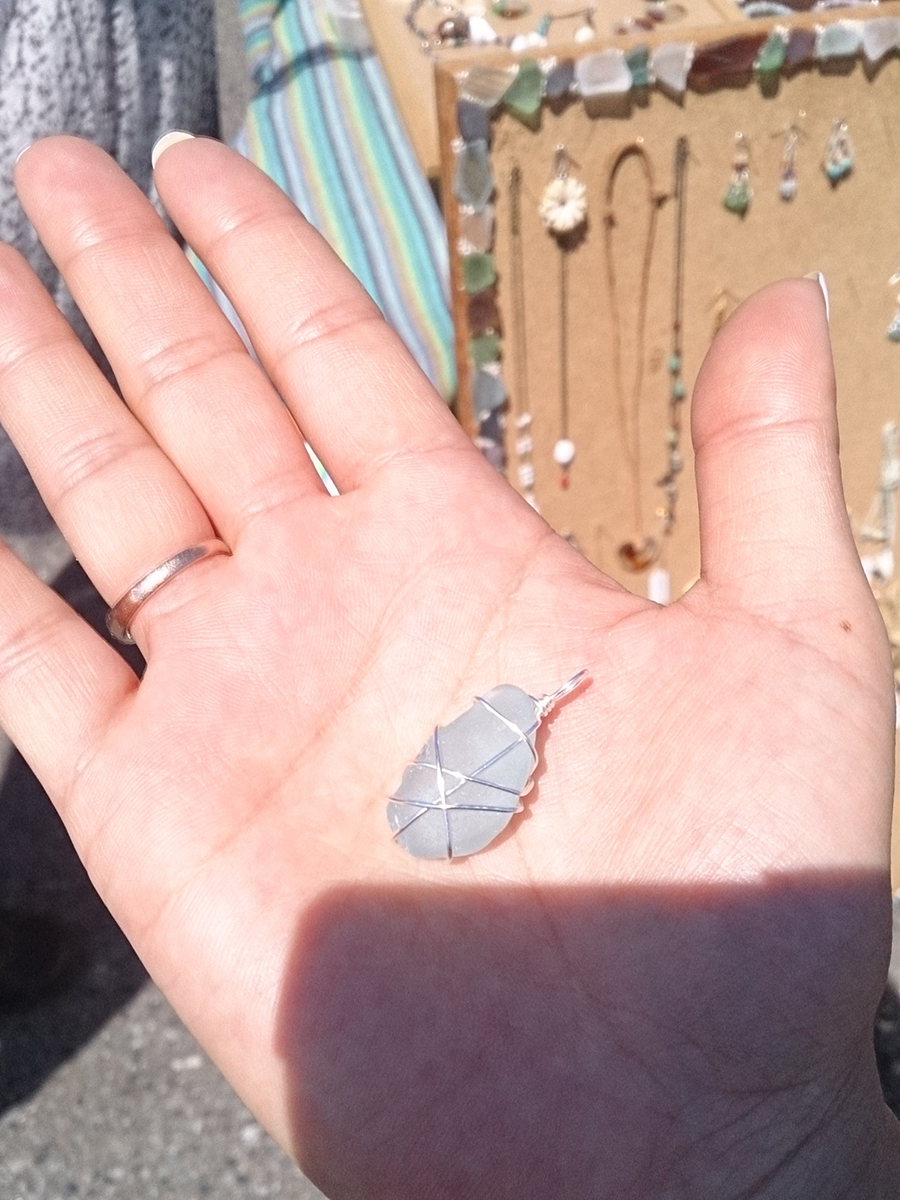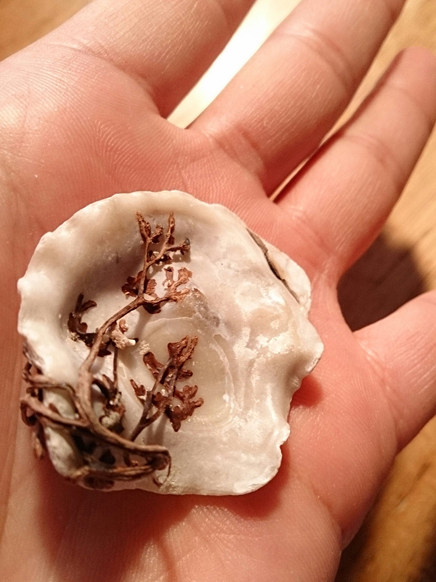 お花みたいな海藻が埋め込まれた貝殻と、