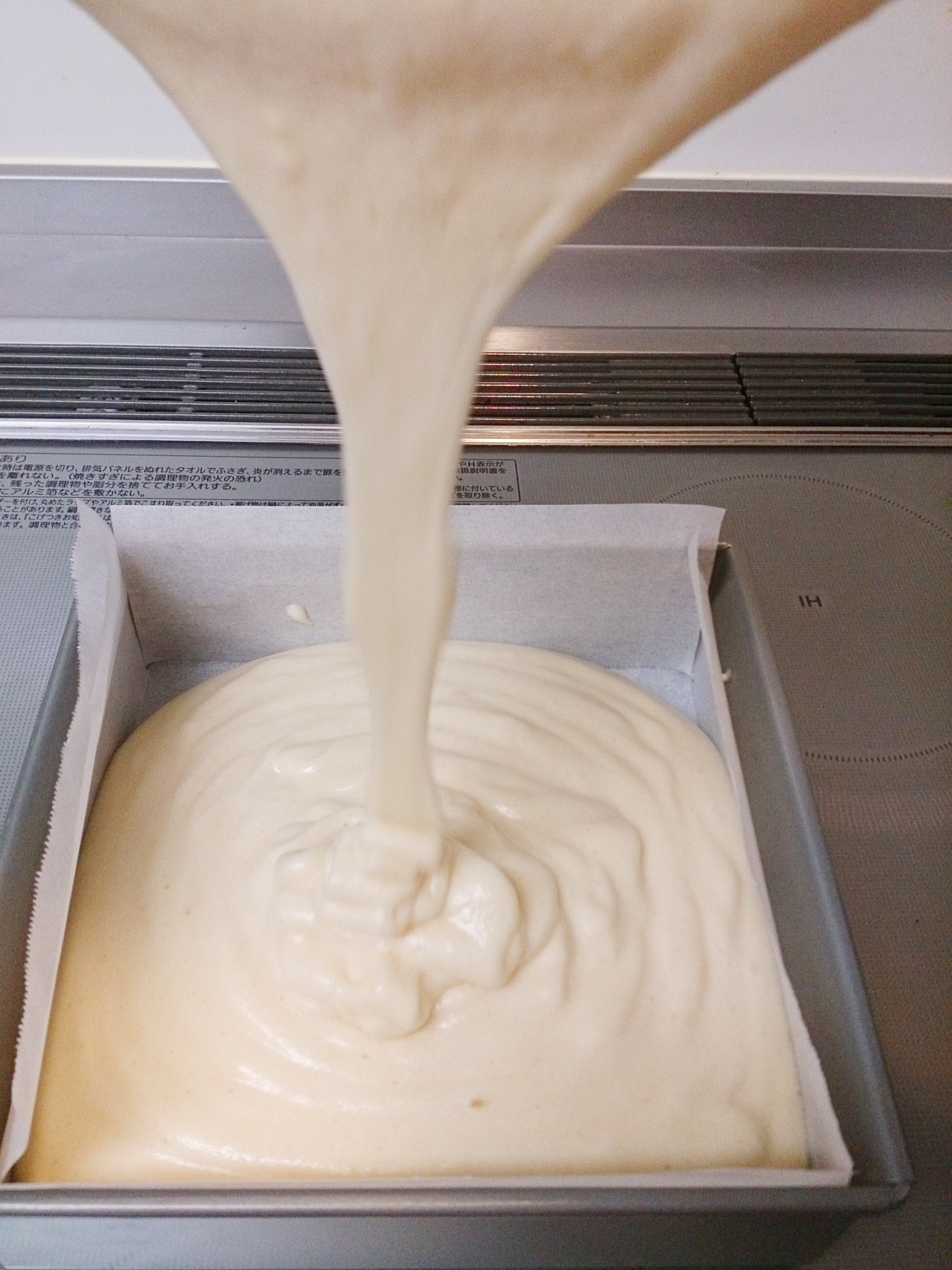 オーブンペーパーを敷いた型に、高い位置から生地を流し入れます。