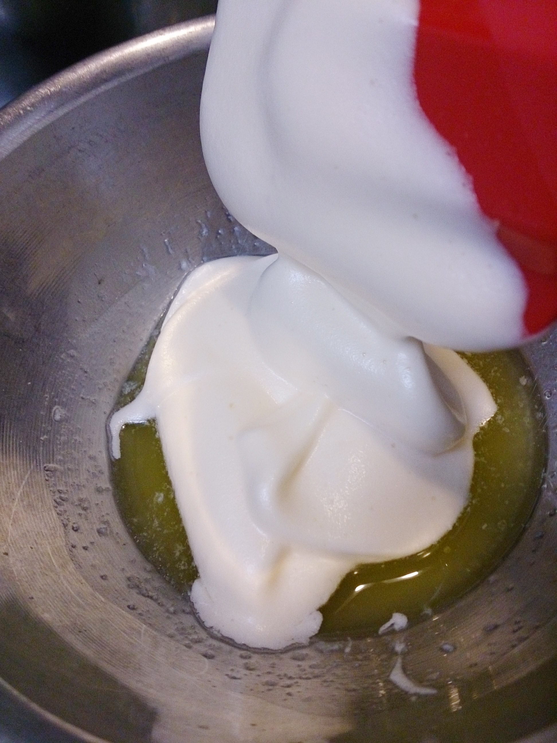 捨てダネを生地のボウルに廻し入れて、サクサク撹拌。
