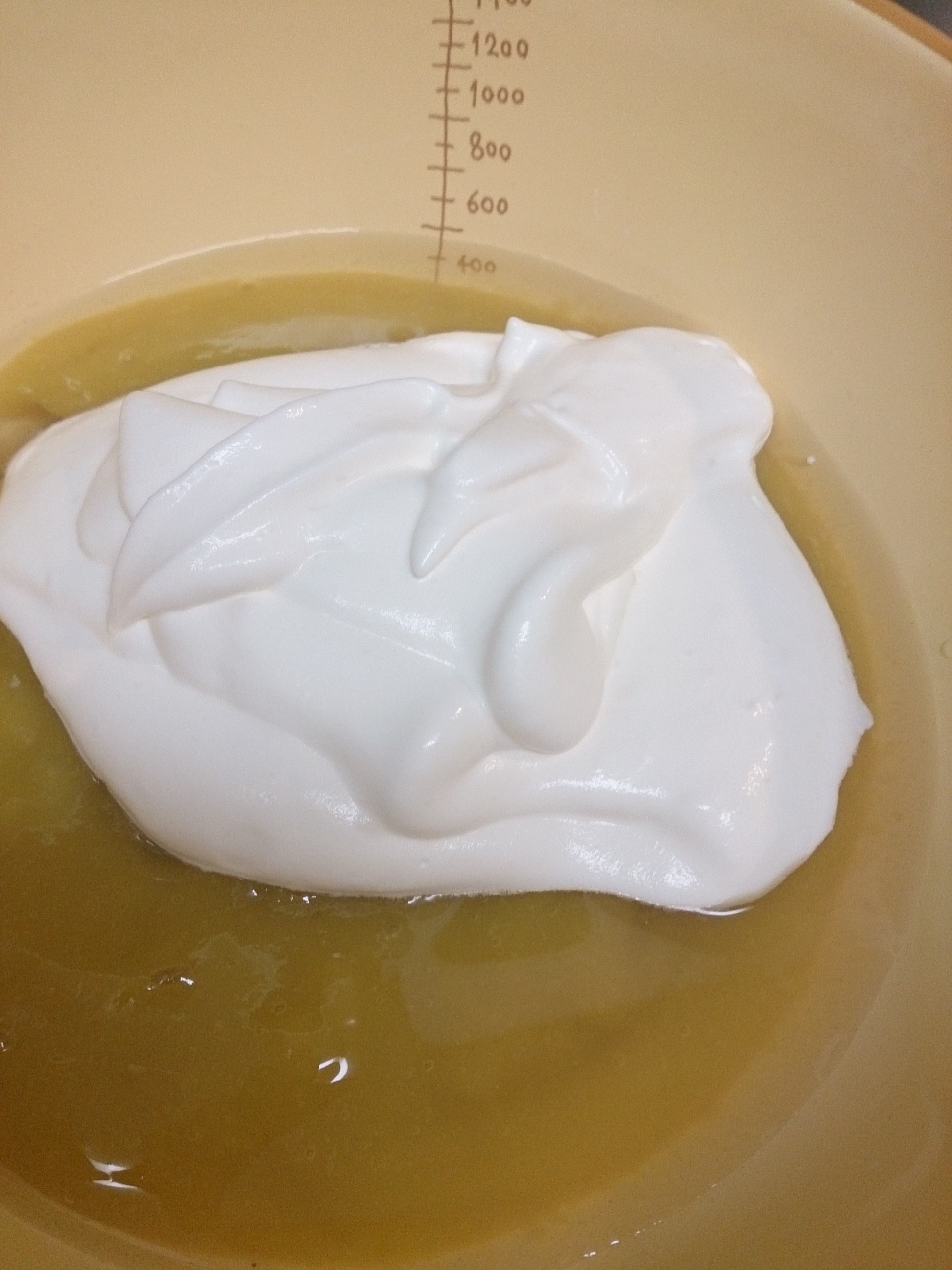レモンゼリーの残りのゼラチン液に、ムース液をおたま一杯分ずつ入れてまぜまぜ。計3杯。