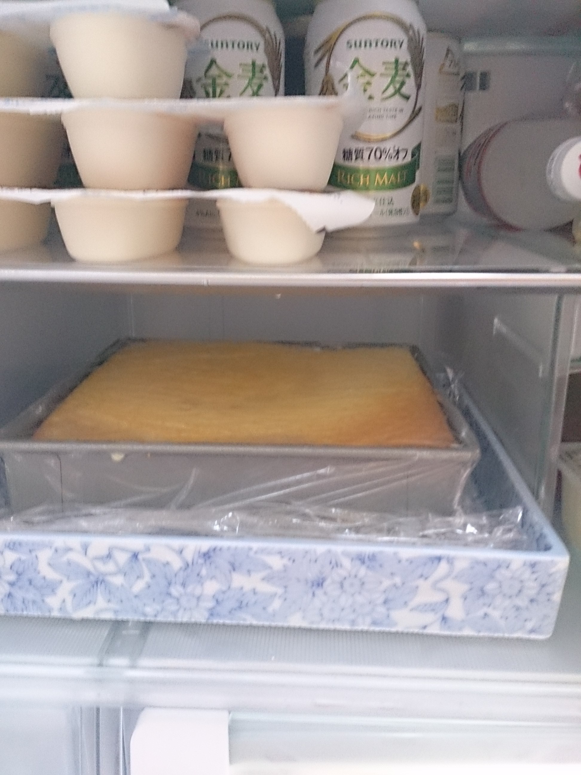ラップをして冷蔵庫で一晩冷やし固めます。