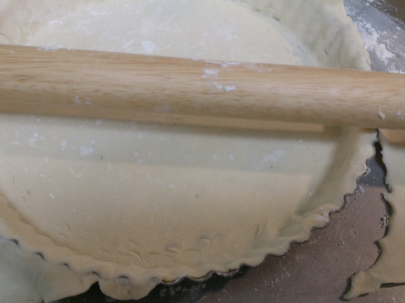 常温に戻したパイシートを麺棒で伸ばしてパイ型に敷きます。