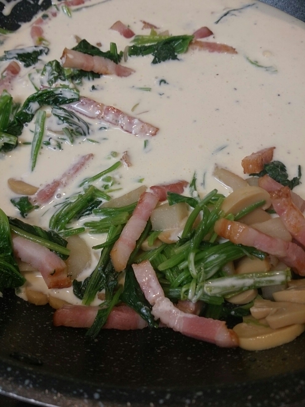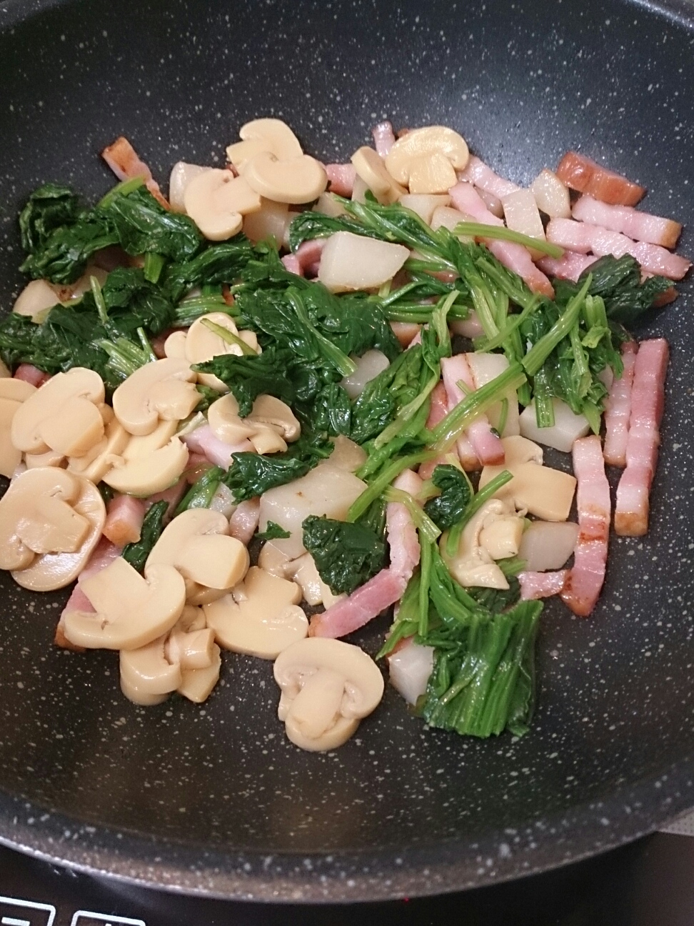 ベーコン→じゃがいも→マッシュルーム→茹でたほうれん草の順に