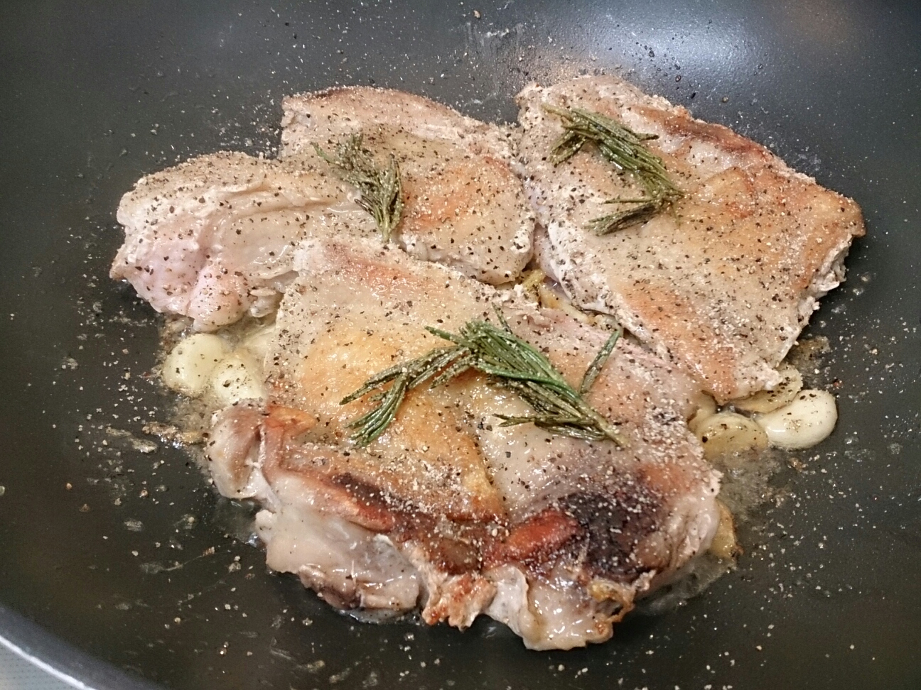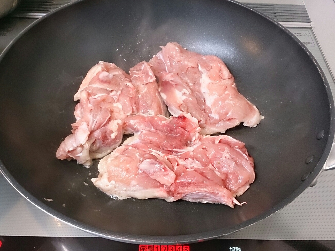 フライパンに鶏もも肉を並べて強火で2~3分焼きます。