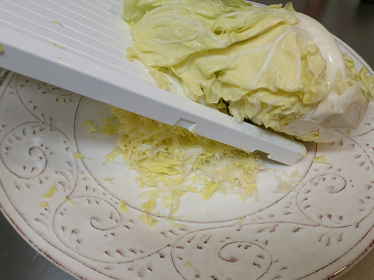 その間にお皿にキャベツの千切りを盛りっと盛っておきます。