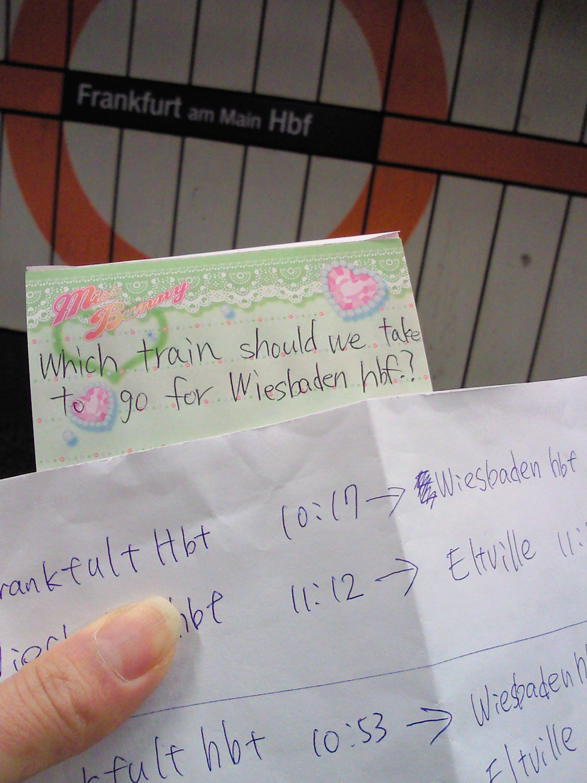 代わりにメモ帳にヴィースバーデン行きの列車はどこで乗れるの?という英文を書いて渡された。ジェィペニーズ・イングリッシュ発動!