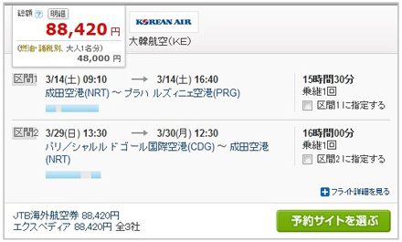 今回の成田→プラハ パリ→成田のオープンジョー(周遊)チケットは88,420円