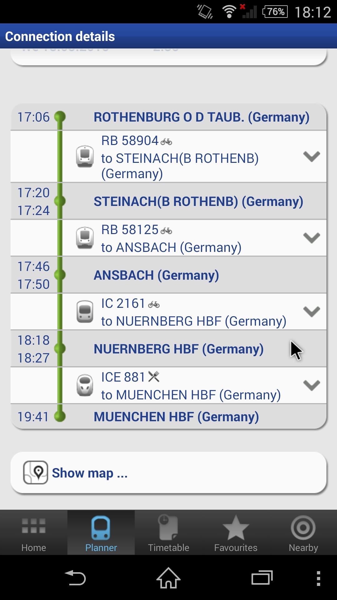 最高に役立ったのは、Eurail.comから出てるRail plannerというアプリ。(無料)(あいぽん用もあるよ)