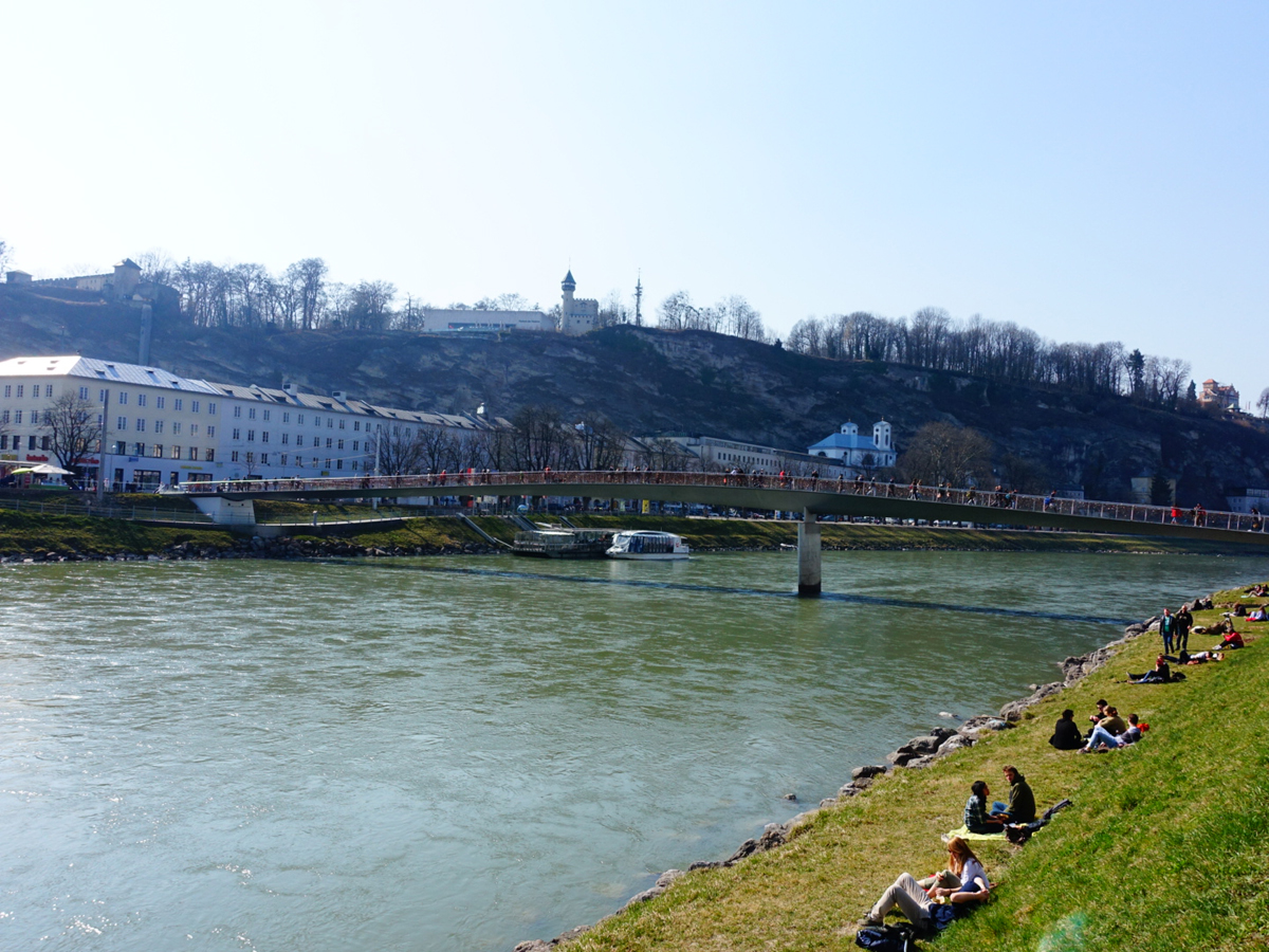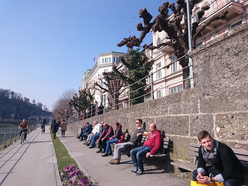 ザルツァッハ川の土手では、老いも若きも皆のんびりと日向ぼっこしてる。