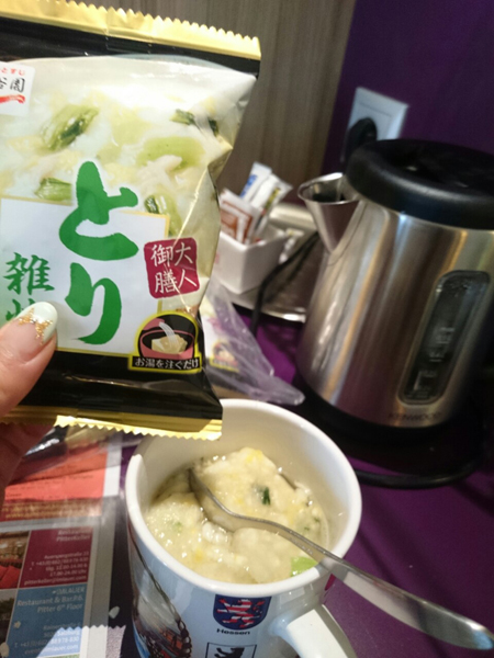 だので今日は持ってきた雑炊食べますです。今まで欧州のホテルで見掛けなかったポットもあるしね!