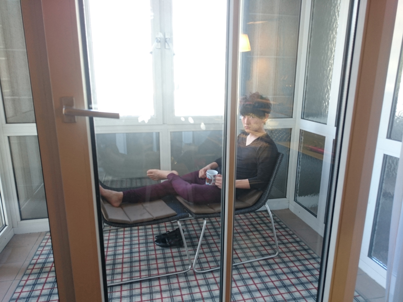 起きたら桜井がテラスにてモモヒキで寛いでる。