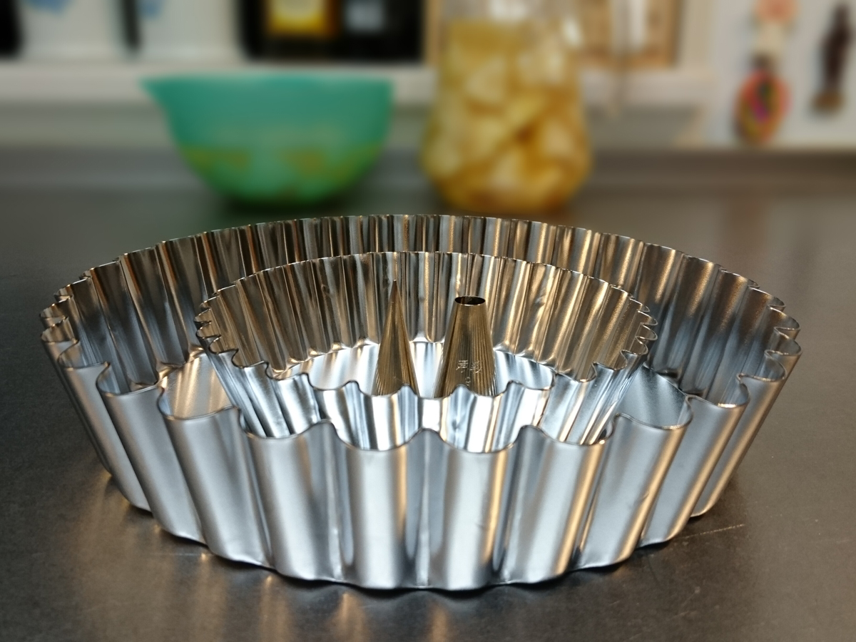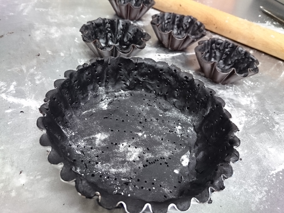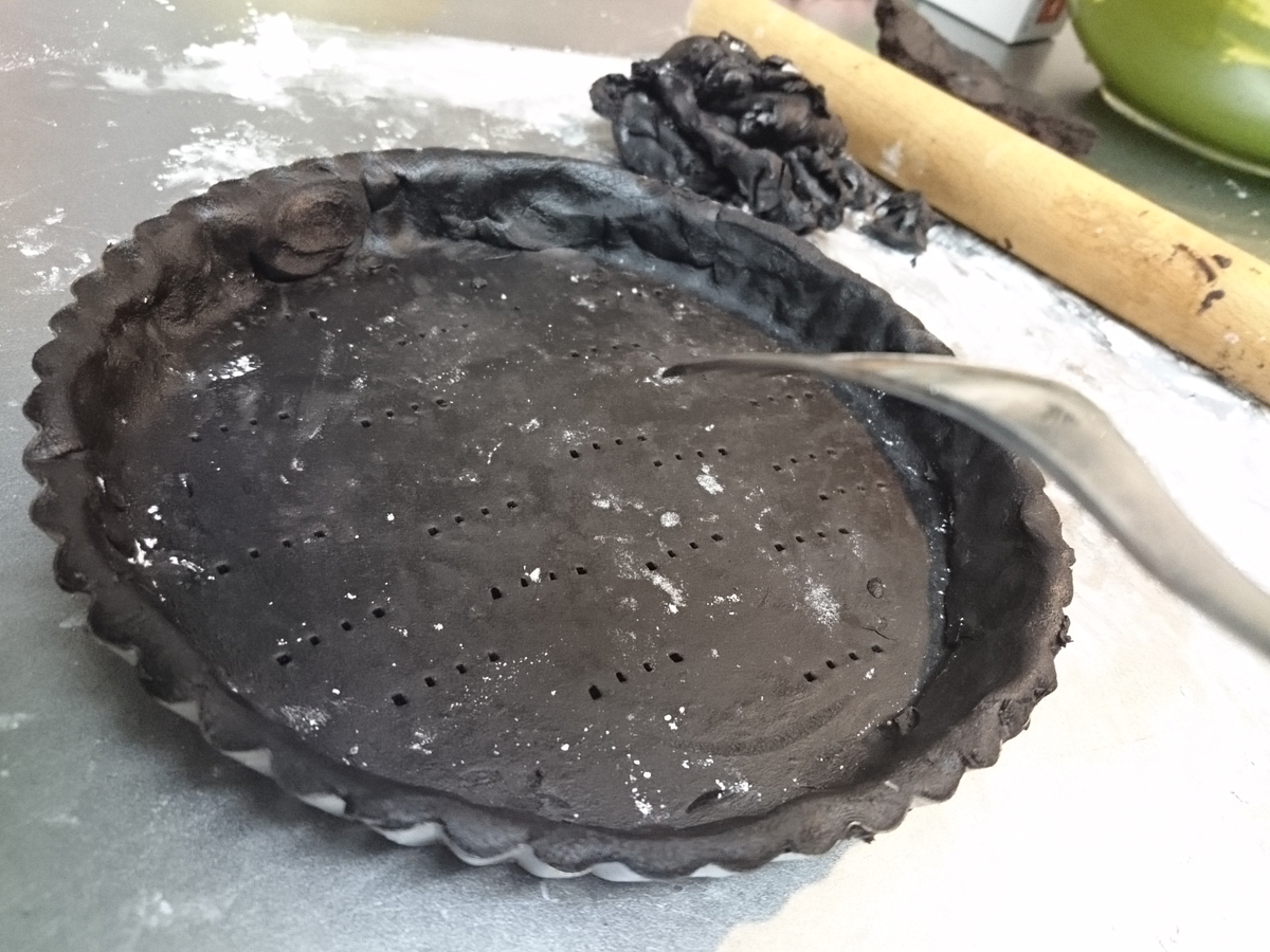 焼き縮みがあるので直径15cm、高さ3cmの深型タルト型である。