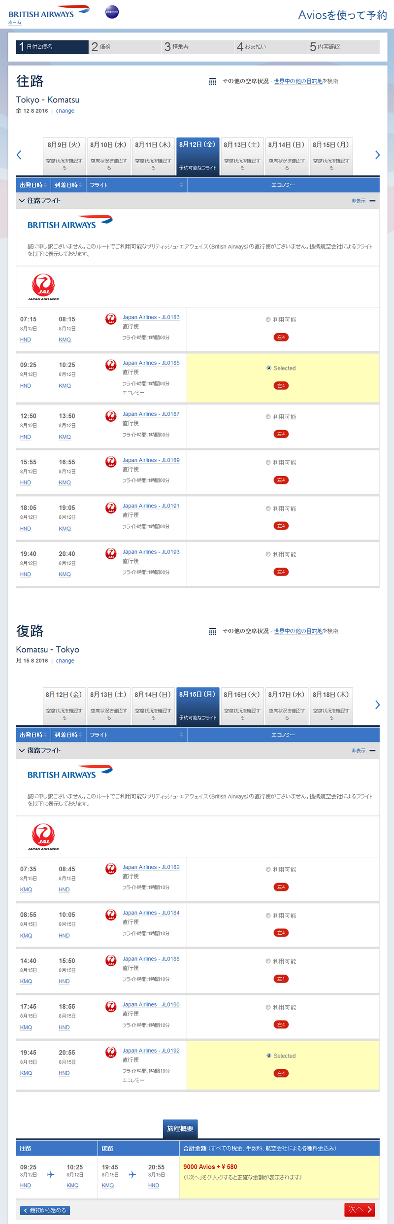 ちなみに、AMEX→BAを使って9,000マイルでJAL国内線を取る手法は