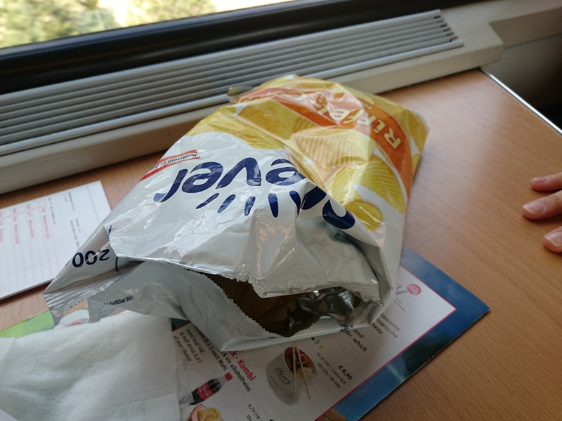 車内販売があるけれどお高いから、買い置きのポテチを貪る。