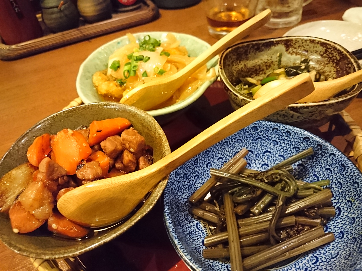 おばんざい4種盛り合わせは、うどと豚肉のきんぴら・蕨の出汁醤油漬け・行者にんにくと三陸わかめの酢の物・石巻産白身魚の揚げ甘酢あんかけ。