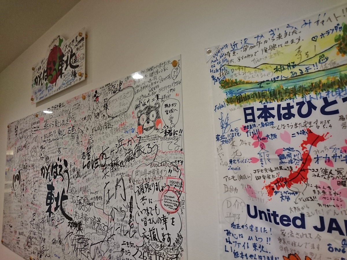 でもホテルの壁に貼られたこんな寄せ書きを見て、被災地だったんだなと再確認させられます。