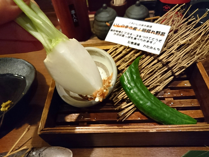 空腹に耐えきれず、お通しの石巻野菜とすぐに来るメニュー、いぶりがっこのクリームチーズ乗せをハイボールでバリバリやる。
