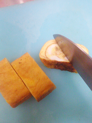 出来上がったたまご焼きをフツーにカットいたしまして